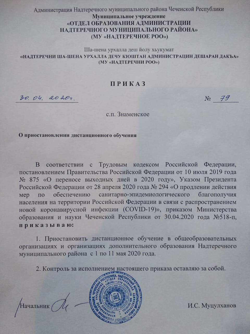 Приказ № 70 от 06.04.2020г. О введении в образовательных учреждениях Надтеречного муниципального района временного порядка сопровождения реализации образовательных программ начального общего, основного общего, среднего общего образования и дополнительных общеобразовательных программ с применением электронного обучения и дистанционных образовательных технологий