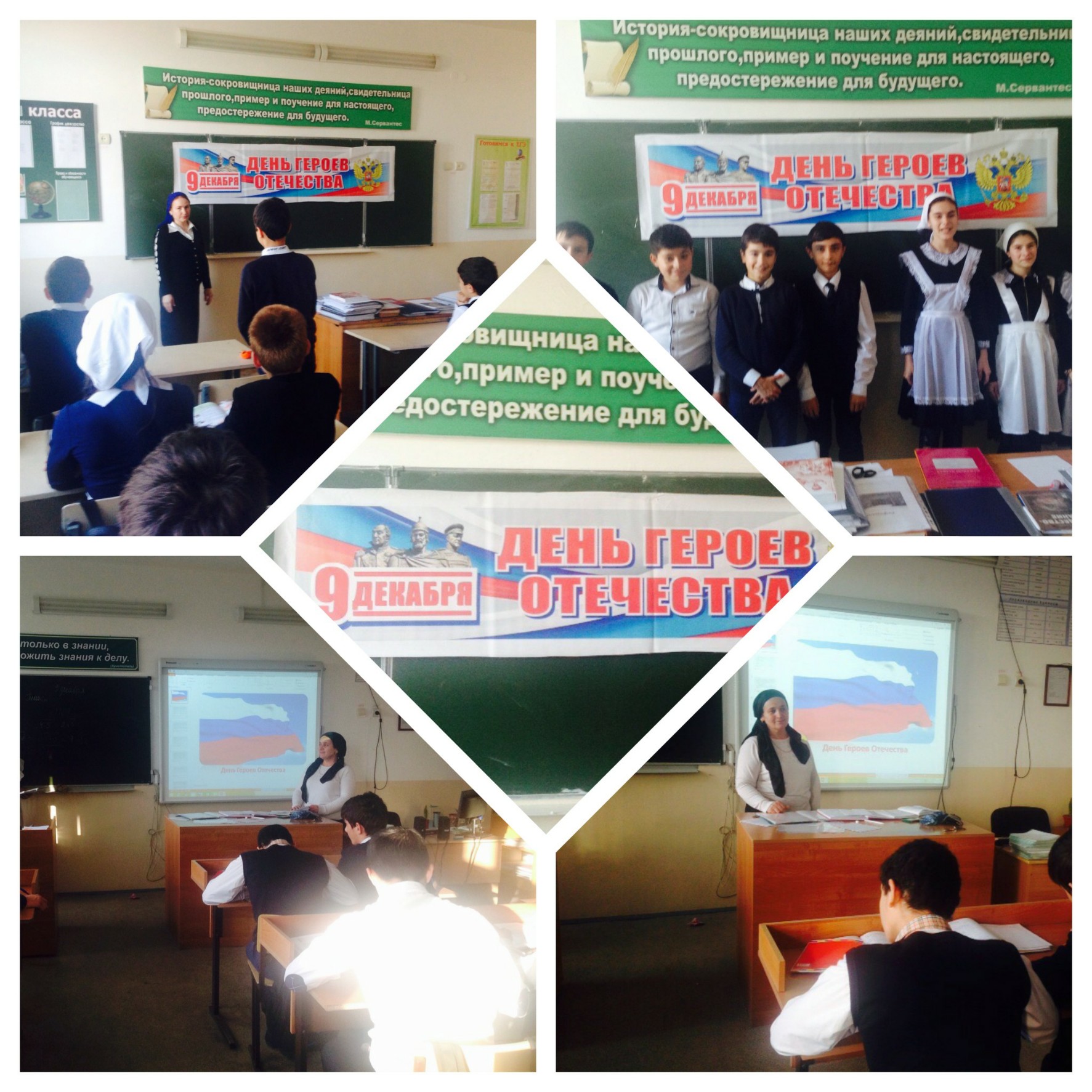 - тематические классные часы и уроки мужества «Великий полководец А. В. Суворов» 6 кл., «Героями не рождаются, героями становятся» 7-8 кл., «О доблестях, о подвигах, о славе» 7-8 кл., «Час чтения былин о русских богатырях». Просмотр мультфильма. 1-2 кл.;- презентация «День Героев Отечества» 5- 8 кл. содержит материал о защитниках Отечества от Александра Невского до наших дней;- соревнования по волейболу среди учащихся 9-10 кл.(Даудов М.М.);- выставка книг «Дорогами войны, дорогами побед» (Гериханова Н.Л.).