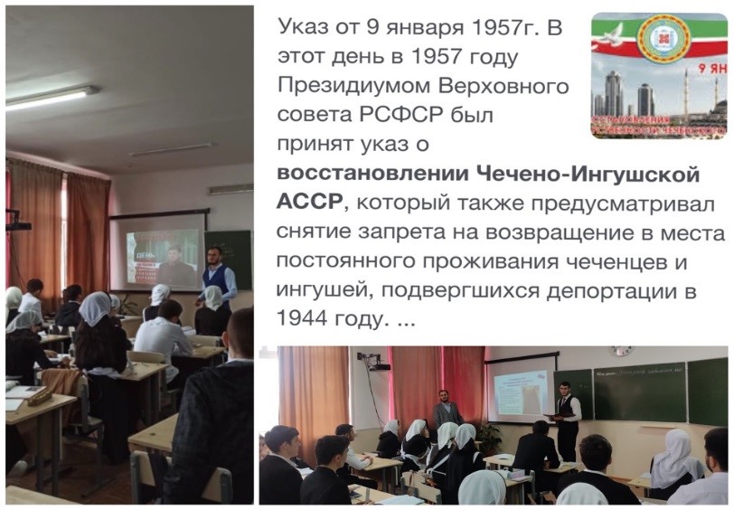 -Учитель истории Денилханов И.Х. провел урок истории «Важные страницы нашей истории», посвященный Дню восстановления ЧИАССР. Цель мероприятия – воспитание у подрастающего поколения чувства патриотизма, формирования познавательного интереса к историческому прошлому своего народа и Чеченской Республики, расширить кругозор учащихся, привить любовь к Родине.